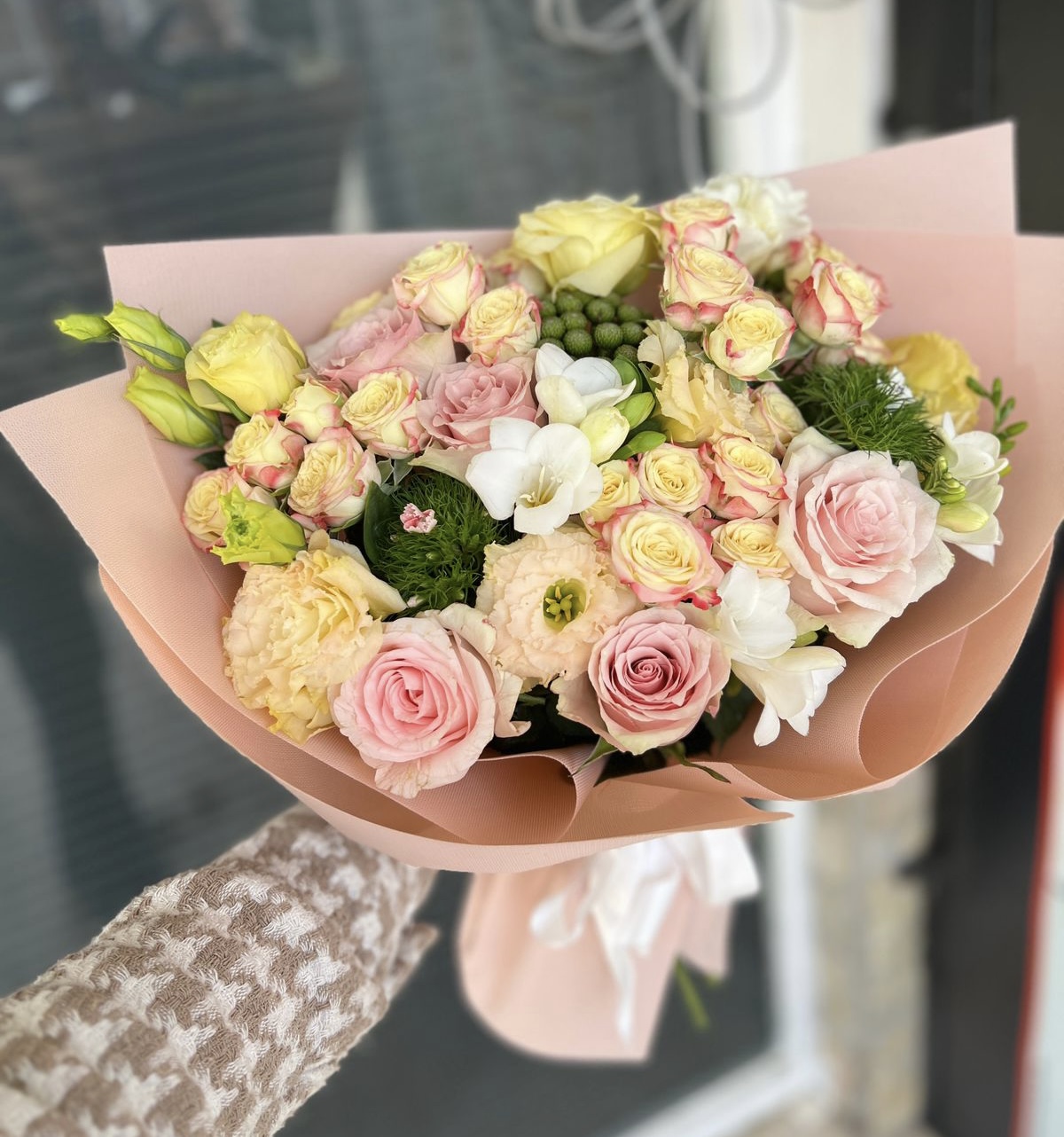 Ürün Kodu: CCK565 gül, 5 sprey gül, 5 eustoma, 3 green trick karanfil, 3 frezya